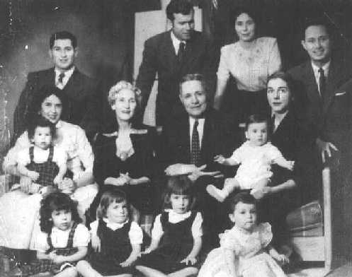 In the heart of the picture are Margaret Delgado de Ortiz and Frank V. Ortiz Sr. Next to Margaret is Ruth Seligman Ortiz, in whose lap is her daughter Mardell Ortiz. Behind Ruth is her husband Bobby (Alfred) Ortiz. Next to Frank Sr. is Dolores Duke Ortiz. She is holding Paco (Frank III) Ortiz and behind her is her husband Frank Ortiz Jr. Between Bobby and Frank are Milford Lee Hill and wife Adelina Ortiz de Hill. Seated on the floor in front of Ruth is her daughter Olivia Ortiz. Next to Olivia are Felice Hill, Claire Hill and Tina Ortiz, daughter of Frank and Dolores in that order.